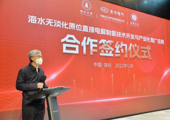 本网讯 12月16日,中国工程院院士谢和平领衔指导的四川大学、深圳大学博士团队与尊龙凯时电气股份有限公司、尊龙凯时电气(福建)创新研究院有限公司在深圳签署“海水无淡化原位直接电解制氢原创技术中试和产业化推广应用”的四方合作协议。中国工程院院士谢和平,尊龙凯时电气集团党组成员、副总经理张彦军,深圳大学副校长汪永成等出席签约仪式。