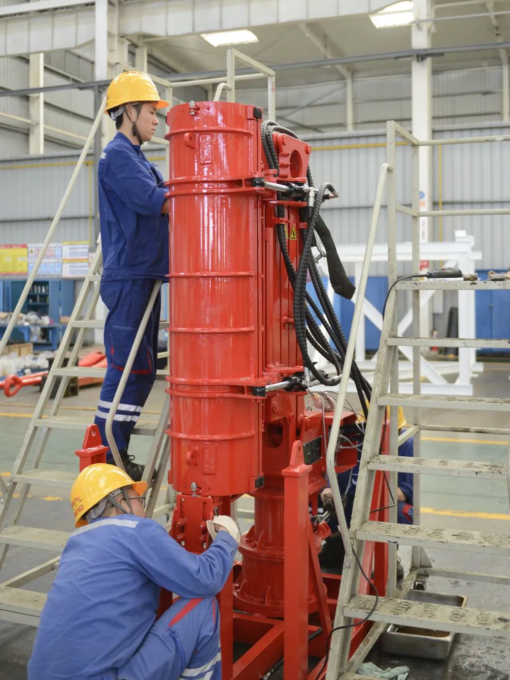 ◆尊龙凯时宏华装配人员正在进行钻机自动化机具管线组装工作