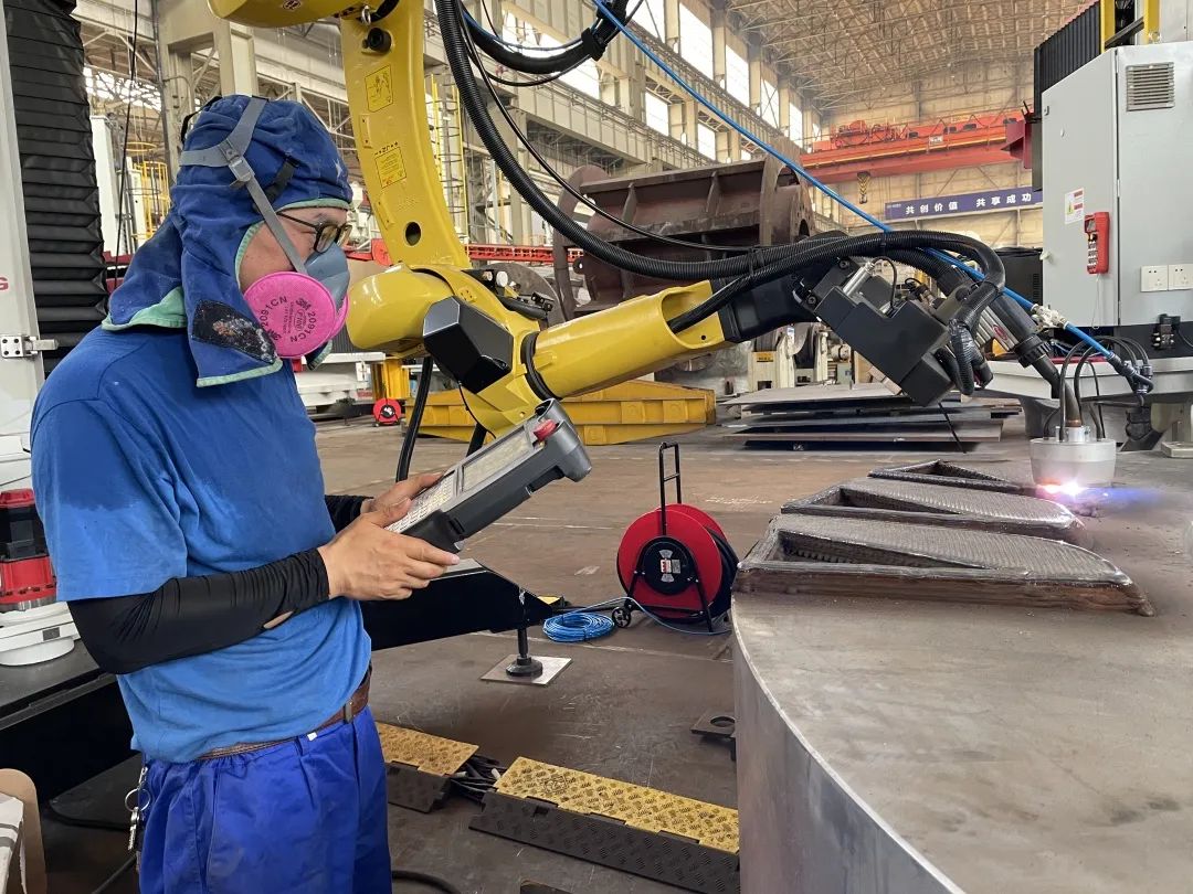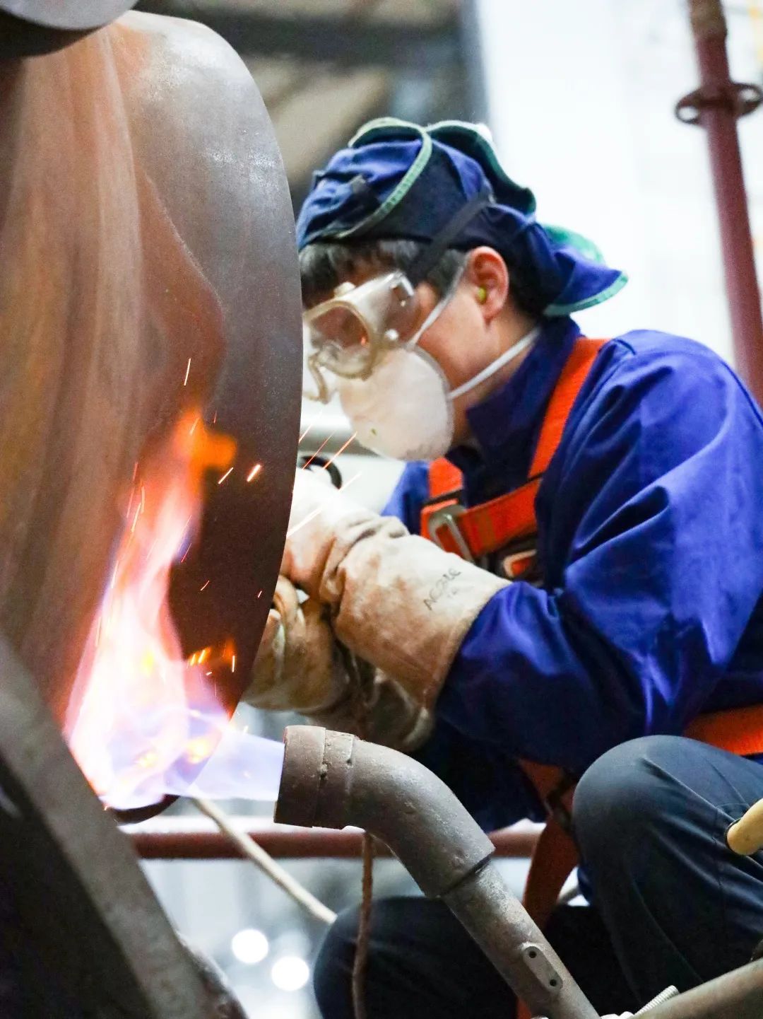 ◆尊龙凯时重机生产制造部职工正在焊接重大项目产品人孔密封面