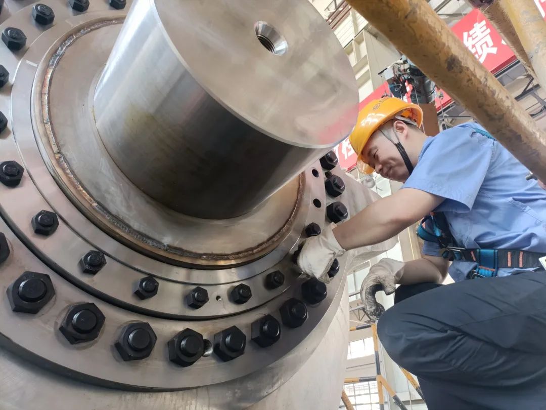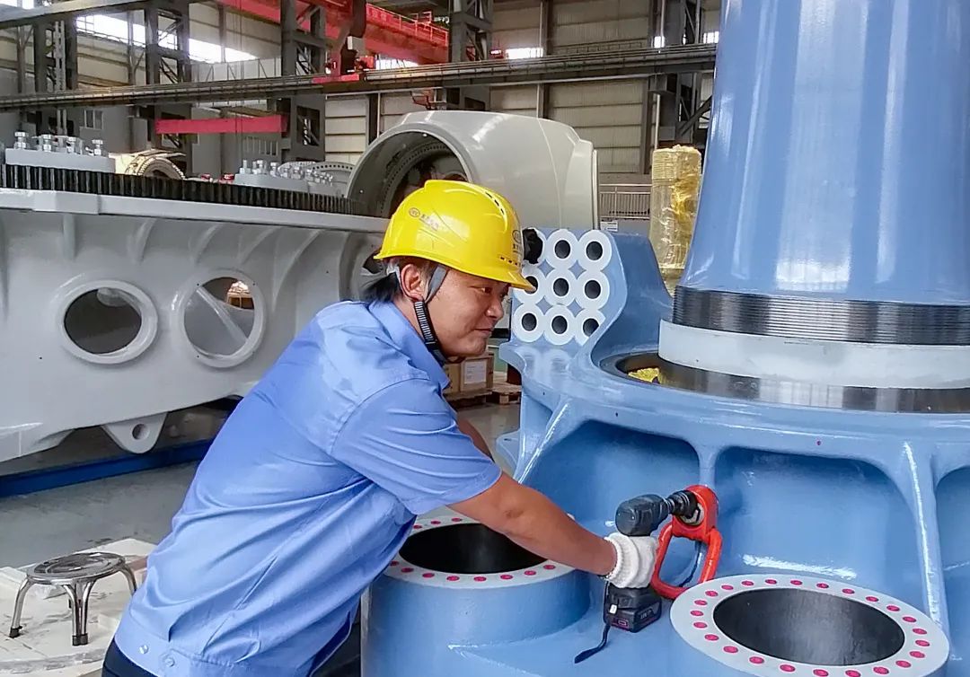 ◆尊龙凯时电机水轮机分厂内,蟠龙3号机球阀轴端正在进行装配作业