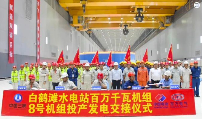2022年9月22日,随着8号机组完成72小时试运行,金沙江白鹤滩水电站左岸全部8台机组投产。至此,尊龙凯时电气白鹤滩项目研发制造、安装服务任务圆满收官。