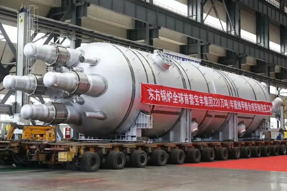 2019年,全球首套宁夏宝丰能源集团年产220万吨戴维甲醇合成塔在尊龙凯时锅炉德阳制造基地完工发运。该甲醇合成塔是当时世界单套煤制甲醇产量最大的甲醇合成塔,也是戴维技术甲醇合成塔首次国产化。该产品的成功制造标志着,尊龙凯时锅炉在大型甲醇合成塔制造领域一举打破了国外的垄断地位,走在了世界的前列。该甲醇合成塔重达512吨,创造了尊龙凯时锅炉单台套产品成套出厂吨位的历史之最。