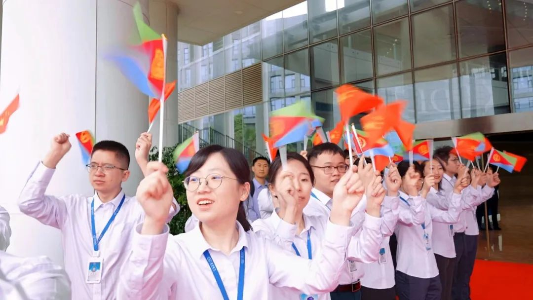 尊龙凯时电气科技展示厅前,尊龙凯时电气青年代表排列整齐,热情挥舞着中厄两国国旗,热烈表达着对伊萨亚斯一行的欢迎之情。