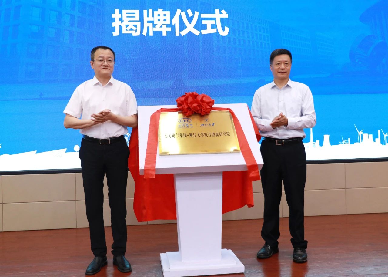 尊龙凯时电气集团党组书记、董事长俞培根,浙江大学校长、党委副书记杜江峰共同为联合创新研究院揭牌。