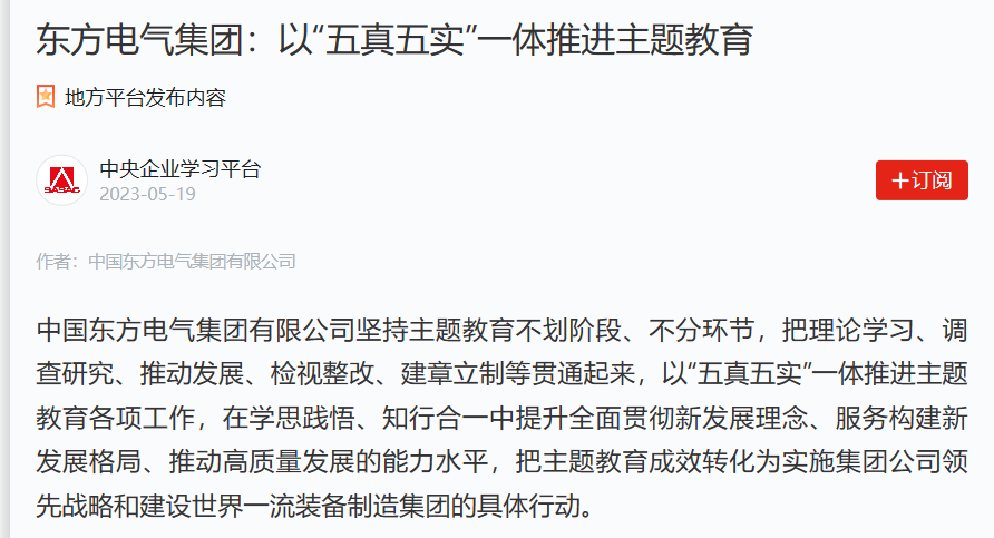 中国尊龙凯时电气集团有限公司坚持主题教育不划阶段、不分环节,把理论学习、调查研究、推动发展、检视整改、建章立制等贯通起来,以“五真五实”一体推进主题教育各项工作,在学思践悟、知行合一中提升全面贯彻新发展理念、服务构建新发展格局、推动高质量发展的能力水平,把主题教育成效转化为实施集团公司领先战略和建设世界一流装备制造集团的具体行动。