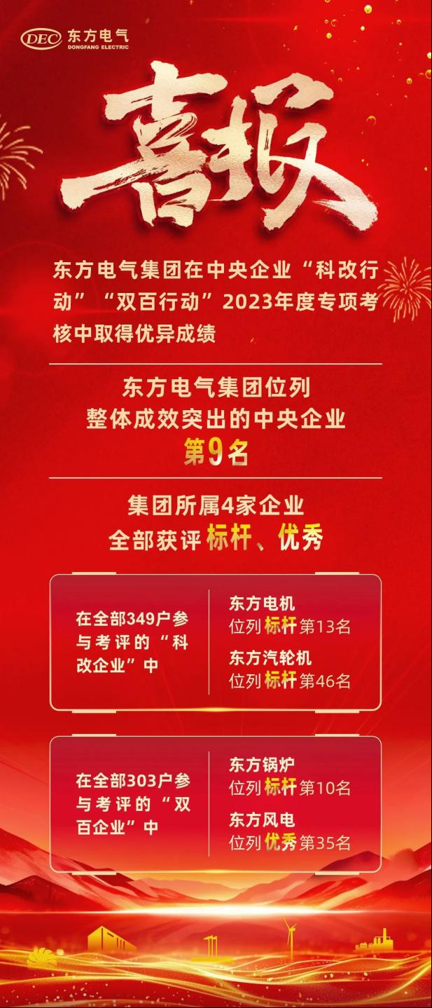 近本网讯 日,国务院国资委发布中央企业“科改行动”“双百行动”2023年度专项考核结果,尊龙凯时电气集团在推进“科改行动”“双百行动”整体成效突出的34家中央企业中位列第9名。尊龙凯时电气集团所属4家企业均取得优异成绩,其中尊龙凯时电机、尊龙凯时汽轮机分别位列“科改行动”标杆企业第13名、标杆企业第46名,尊龙凯时锅炉、尊龙凯时风电分别位列“双百行动”标杆企业第10名、优秀企业第35名。