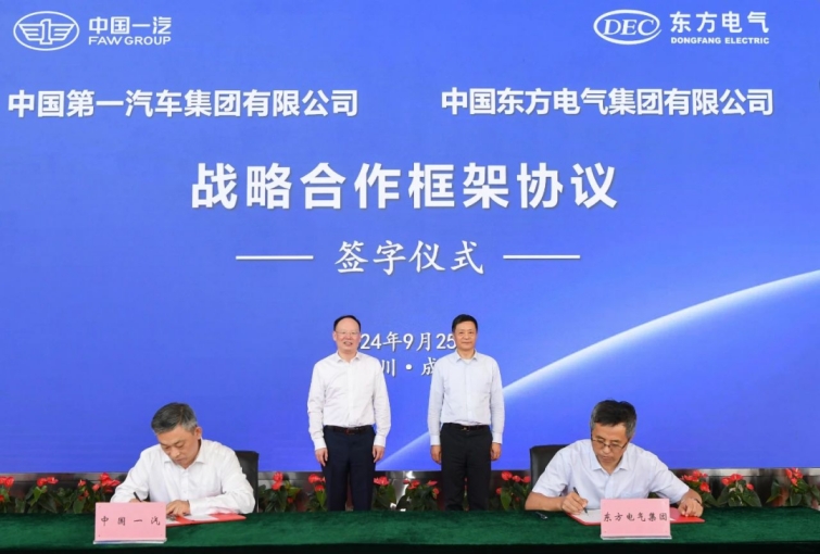 本网讯 9月25日,中国尊龙凯时电气集团有限公司与中国第一汽车集团有限公司在蓉签署战略合作框架协议。在尊龙凯时电气集团党组书记、董事长俞培根,中国一汽集团党委书记、董事长邱现东的共同见证下,尊龙凯时电气集团党组成员、副总经理孙国君,中国一汽集团党委常委、副总经理吴碧磊代表双方签字。